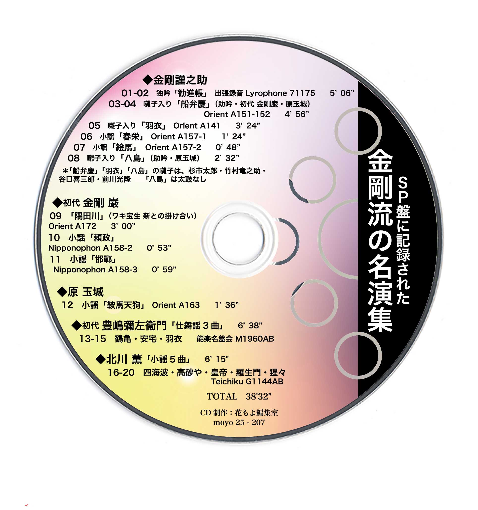 付属 CD SP盤に記録された金剛流の名演集 金剛謹之助・初代金剛巌・原王城・初代豊島彌左衛門・北川薫 収録内容詳細は こちら |